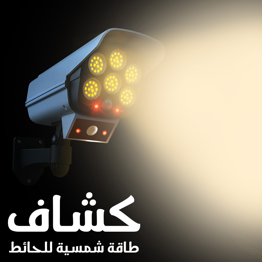 كشاف 2 في 1، شكله كاميرا وهمية لكن حمايتك حقيقية! يشتغل بالطاقة الشمسية، ذكي، ساطع، وبيخوّف الحرامي قبل ما يقرّب! 💡🔒