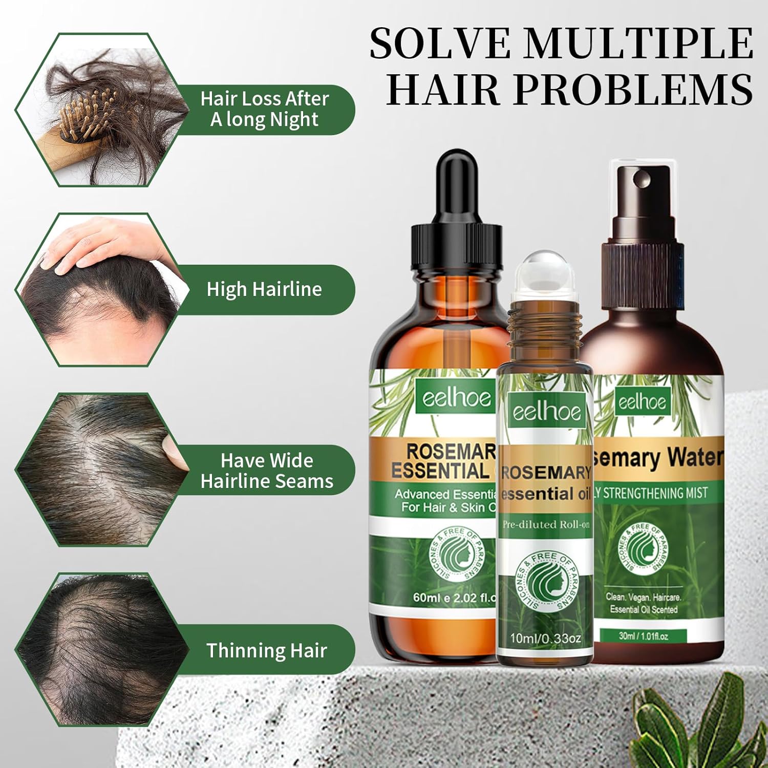 تصميم عملي – يتضمن زيت أساسي مع قطارة، رول-أون، وبخاخ ماء الروزماري لتوفير خيارات مريحة وسهلة الاستخدام.