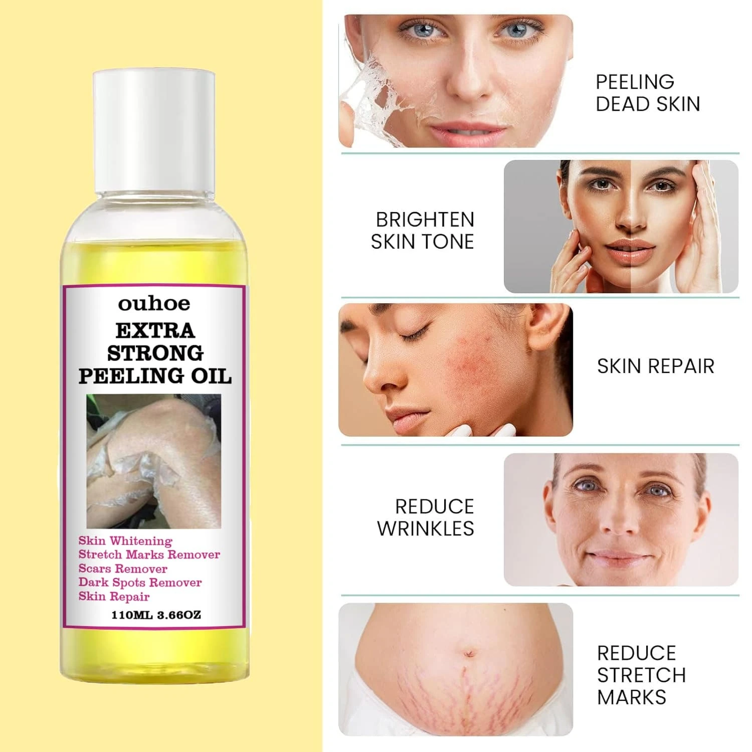 "استمتعي بتجربة تقشير طبيعية مع زيت التقشير الأصفر. غني بمضادات الأكسدة التي تحمي بشرتكِ من التلف، ويعمل على تجديد خلاياها."
